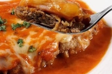 "Delicioso polpetone recheado, servido com molho de tomate e queijo."